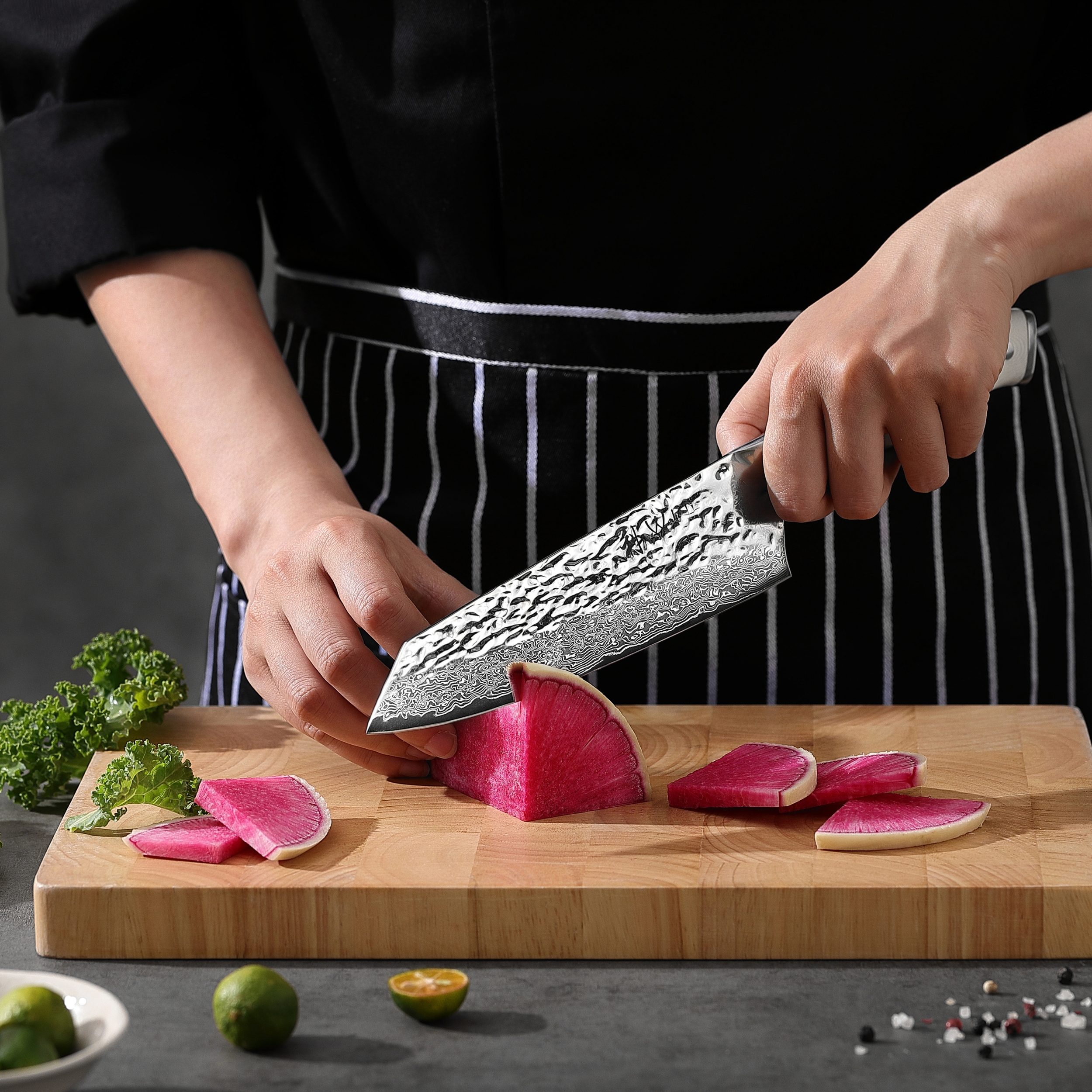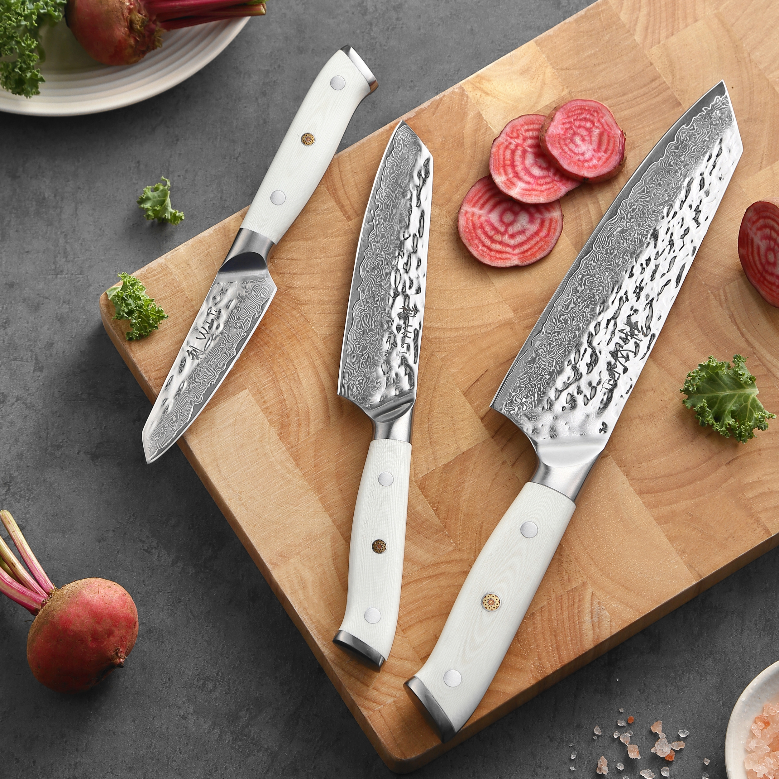 Alle Messer verfügen über Klingen aus 67 Lagen Damaststahl mit einem Kern aus VG-10. Die Schneiden sind glatt ausgeführt und beidseitig geschliffen. Die Damaststruktur ist materialbedingt.